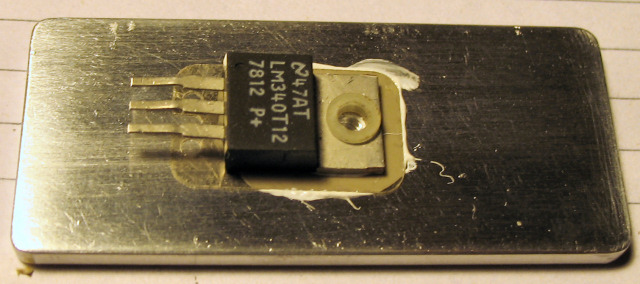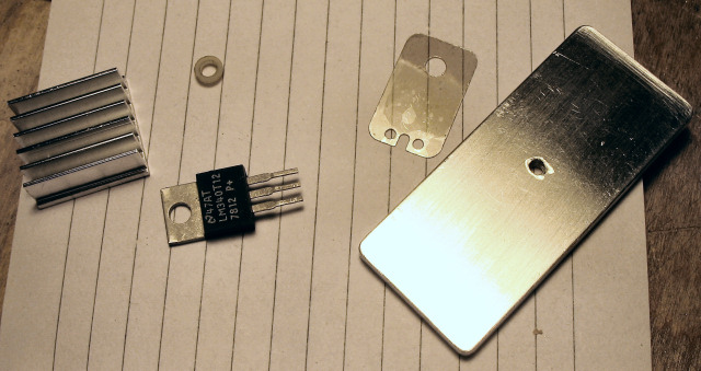 These are the parts I used. You can see the regulator mounting kit. Just a mica (I think) insulator and a flanged plastic washer to keep the regulator electrically insulated from the heatsink, yet thermally coupled. The aluminum heatsink is 1" wide x 1/8" thick x 2.25" long. A hole was drilled and tapped for a 3mm screw roughly in the middle. I also am using a piece of a heatsink from my spare parts bin.