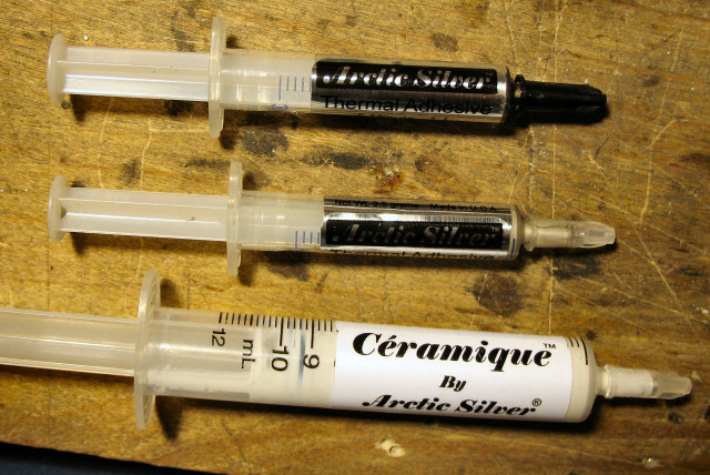 The Artic Silver products I'm using. The "Ceramique" is a thick type of thermal compound (not adhesive) for the regulator. The thermal epoxy is to hold the finned heatsink to the Al slab.