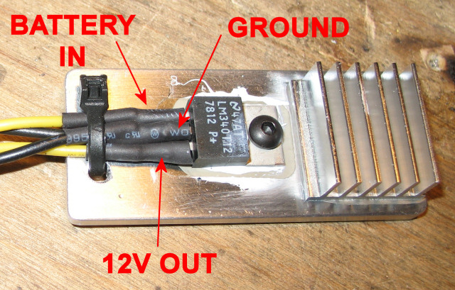 I thermal epoxied the finned heatsink on the end of the slab. Then I soldered the wires on the regulator. The center pin is ground. Make sure two ground wires go here - one from the batts and one to the load. Just strip the ends, twist the wire together, and solder it to the center pin. The leftmost pin is the input from the batteries. The rightmost pin is the 12v output. Then put some heatshrink over the connections. Also note the holes drilled on the side of the wire. The zip tie is a crude strain relief.