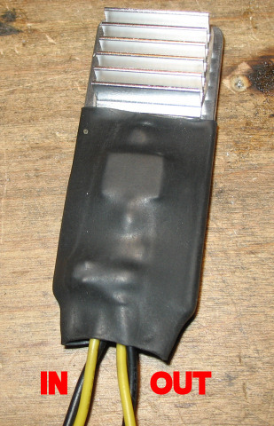 The finished part with some heatshrink over the whole thing. Make sure to keep at least half the heatsink uncovered, but make sure the regulator itself IS covered. Twist one ground wire (doesn't matter which one) with the input wire to go to your batteries. Twist the other ground wire with the output wire to go to your fan(s). That's it!