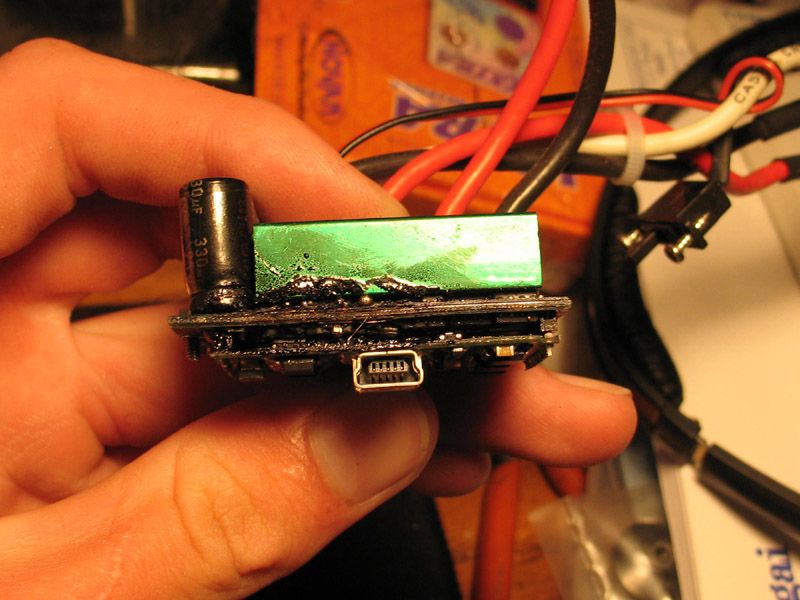 On the next day, Sunday, I put another 5mins. with a puff of smoke ending the run. I hadn't been doing anything out of the ordinary, and there was a fan over the MM. Funny thing is, I'm currently running an older MM (my 2nd one, from maybe 4 months ago), and even without a fan it seems to be doing fine (with constantly pegging the throttle, and then pegging the brake).