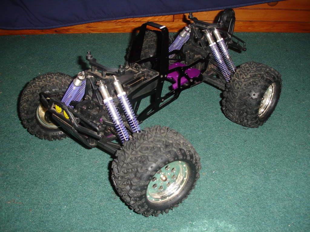 Got a new HPI low cg chassis along with my new savage and I plan onto to convert it. The problem Im having is I can seem to fit my FlightPower 3200mah 5s lipo anywere on the chassis. I have the idea to custom fabricate an upper deck and mount it up their but really dont want to go threw the hassle... I dont want to lount it on the origianl nitro motor plate because the outrunner Im getting has a 53/30 stator and needs all the room it can get. Here is a pic of my savage and its new chassis. Already got a few scratches on it.