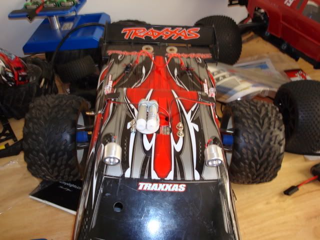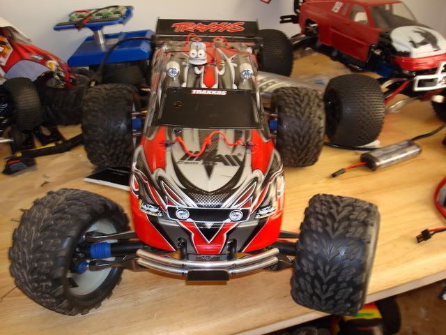 that is the truck running the flextek arms. has alot of hopups and getting ready for more. somehopups are more noticable than others. anyways the truck is getting ready for a massive overhaul and i feel it is time to talk about the arms. i love the look of them and dont regret the purchase. they have held up very nicely to some severe bashing. to put things into perspective out of 35 traxxas vehicles only aorund 10-15 are bashers. and all but my spirit and street sport are down with damage. some more severe than others. the emaxx is getitng ready for alot of work with some new parts rolling in and also needing a massive overhaul since almsot all the screws are rusted. anywyas i had heard people saying that the bottom of the shock doesnt stay on the arm without loctite. i cant verify this for a fact since i hit mine with loctite. i have no issues at all with them coming loose. the arms themselves are helping keep the truck performing how i want. which is more like a real mosnter truck than anything else. with almsot nothign to get airborne off of the truck gets some sick air and usually flies nose up. this is what i wanted and i am veryy happy. all told the arms are holding up nicely even with a severely stiff suspension setup like what i got.