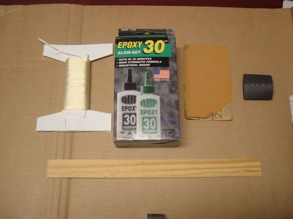 Heres a pic of my supplies, 30min epoxy, 80 grit sandpaper, vectran thread, shrink tubing, and paint stick: