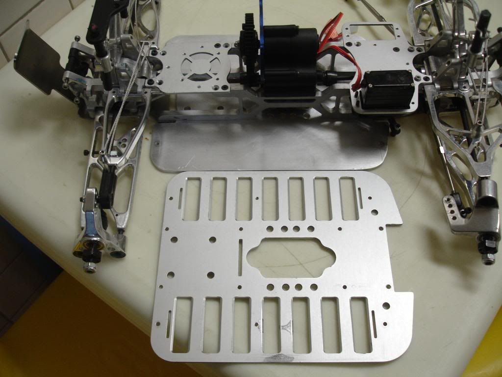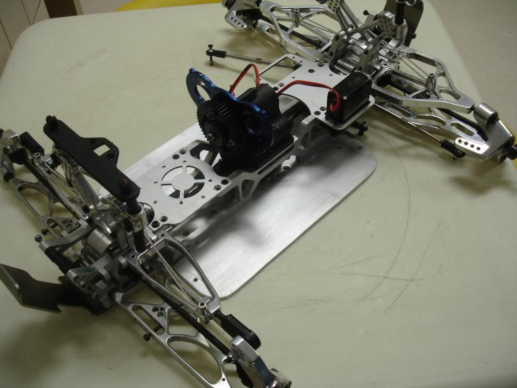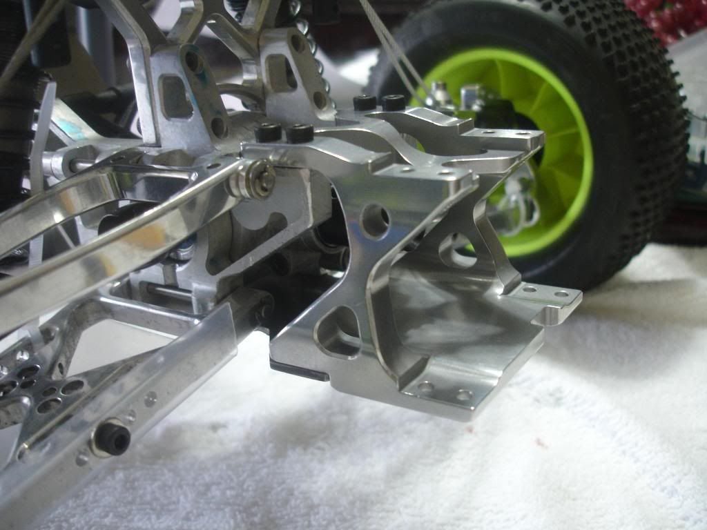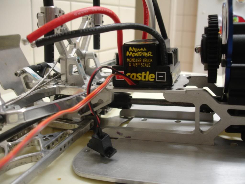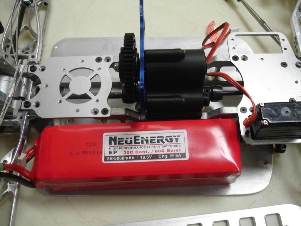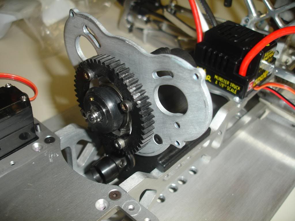 I flip around the tranny so the motor will be towards the rear. I'm still waiting for my UE monoblock for added length. Still waiting for the motor (Medusa 36-60-2000Kv) and batteries from DMA.