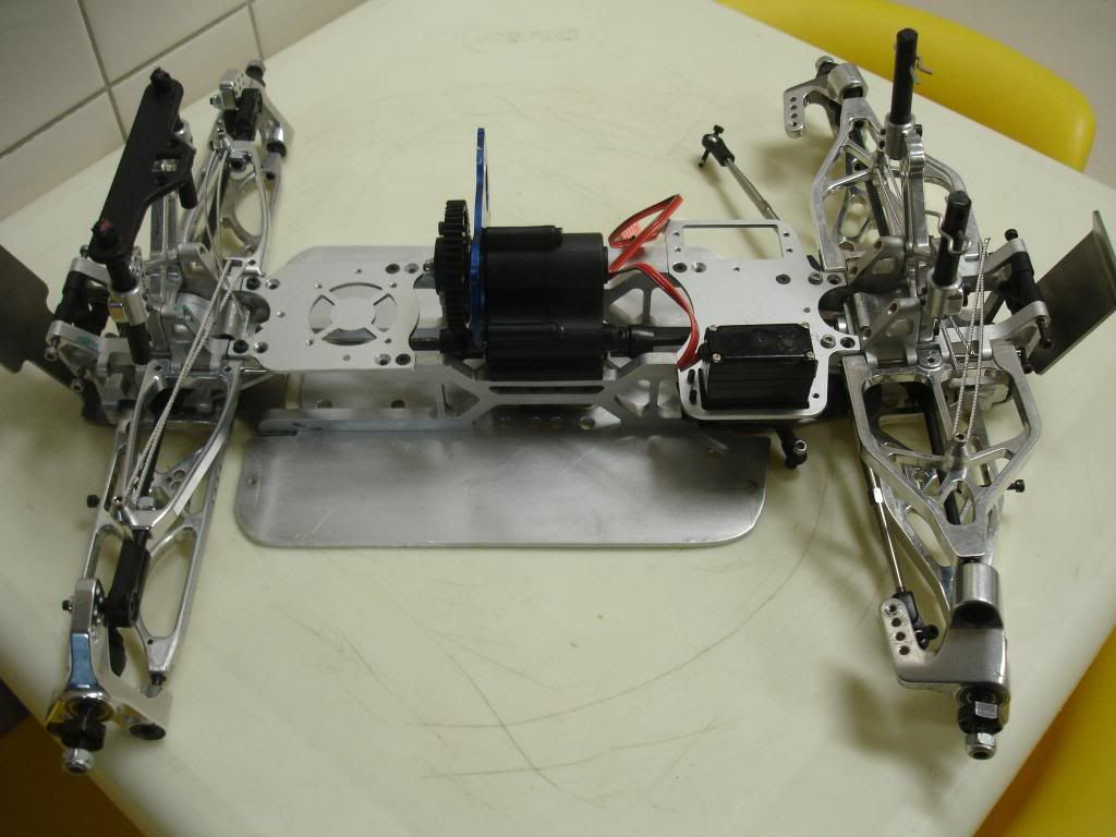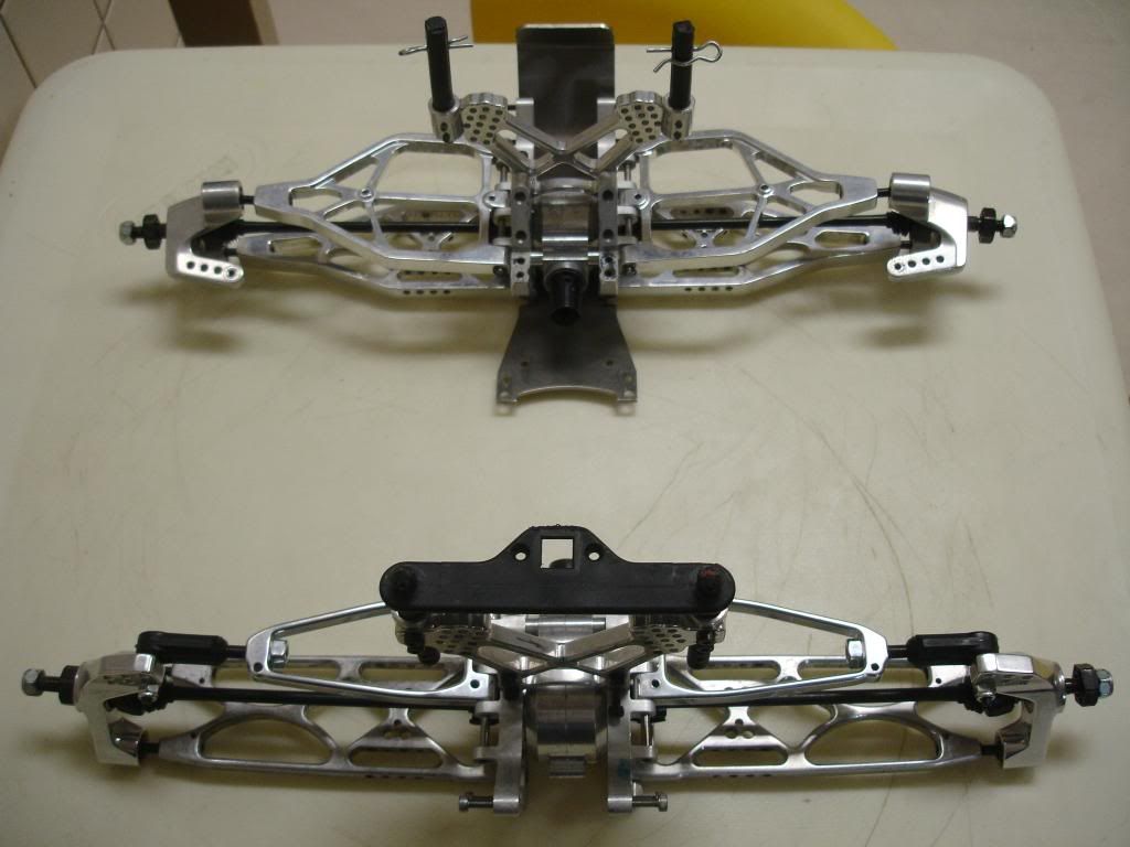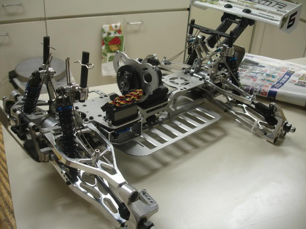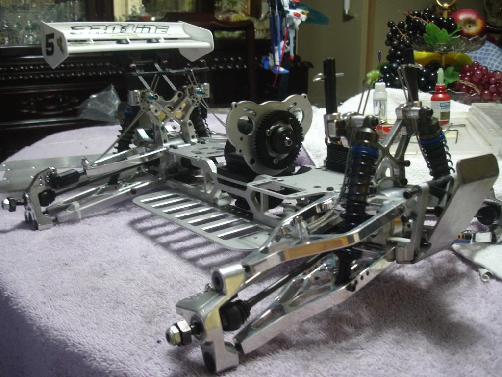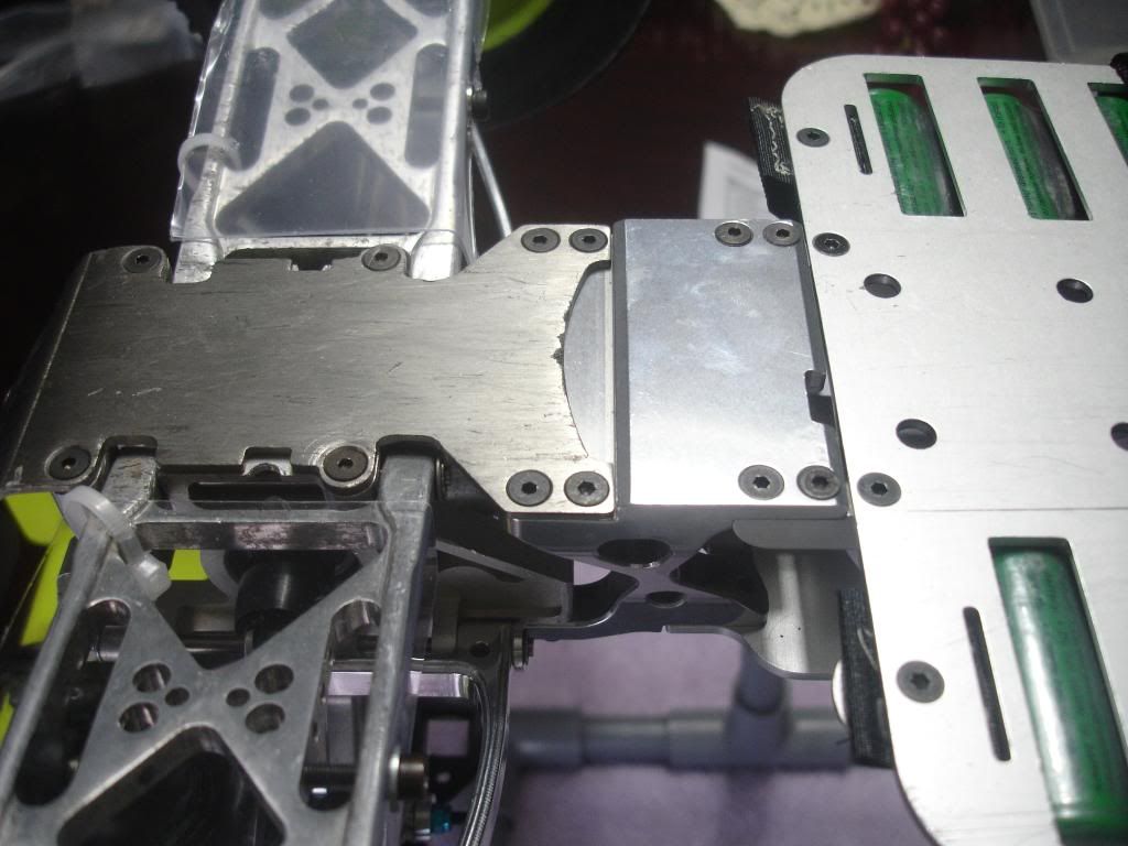 I flip around the tranny so the motor will be towards the rear. I'm still waiting for my UE monoblock for added length. Still waiting for the motor (Medusa 36-60-2000Kv) and batteries from DMA.