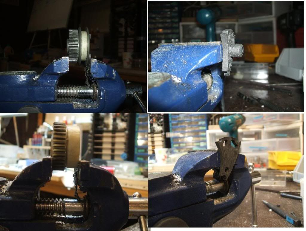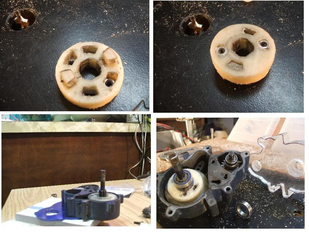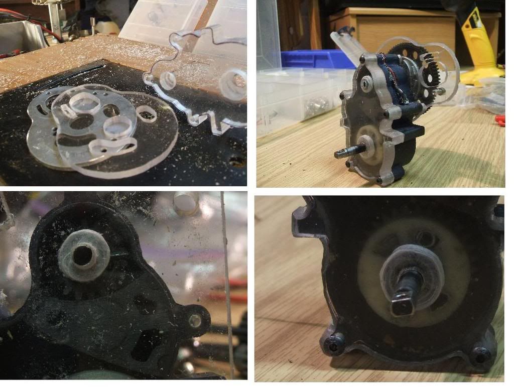 After I did the first two holes. I worked on getting what ever was sitting above the 1/2 case to sit flush with (or slightly below) the lip of the half case. I removed the top half of the idler gear post and a sanded it down a little. For the dog drive to sit flush. I drilled a small indent slightly smaller then the nut I had holding it and the second gear. I took a screw and put in into the nut from the topside of the nut and tapped the nut into the recess I just drilled for it. I used a 3x12 screw to secure the to parts together. Then with the nut and scew recessed into both gears. I went to hacking away at the dog drive carrier. Cut the two lips off it (back one mainly to be able to see the teeth on the output gear) and then sanded the outside that would face the lexan down.