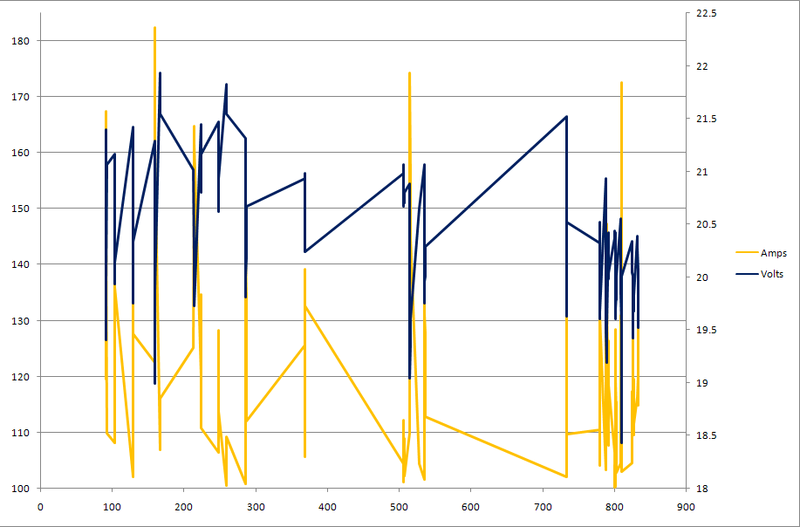 The packs held up pretty well though, I think. For the record, the 18.43V was actually at that last 132A spike right near the end of the run. It was 19.88V (3.31v/cell) at the 182A spike toward the beginning.