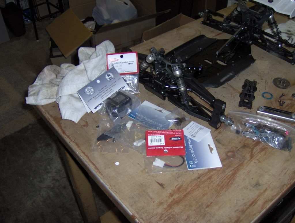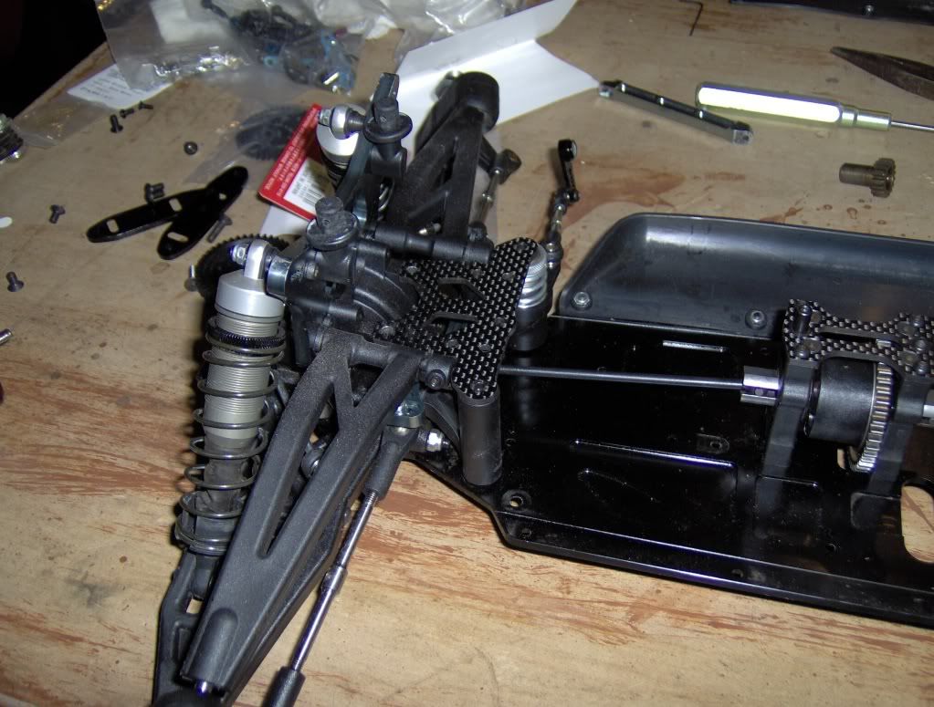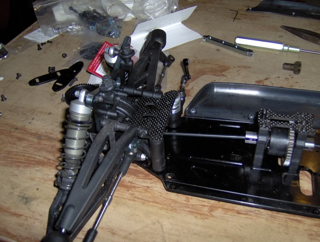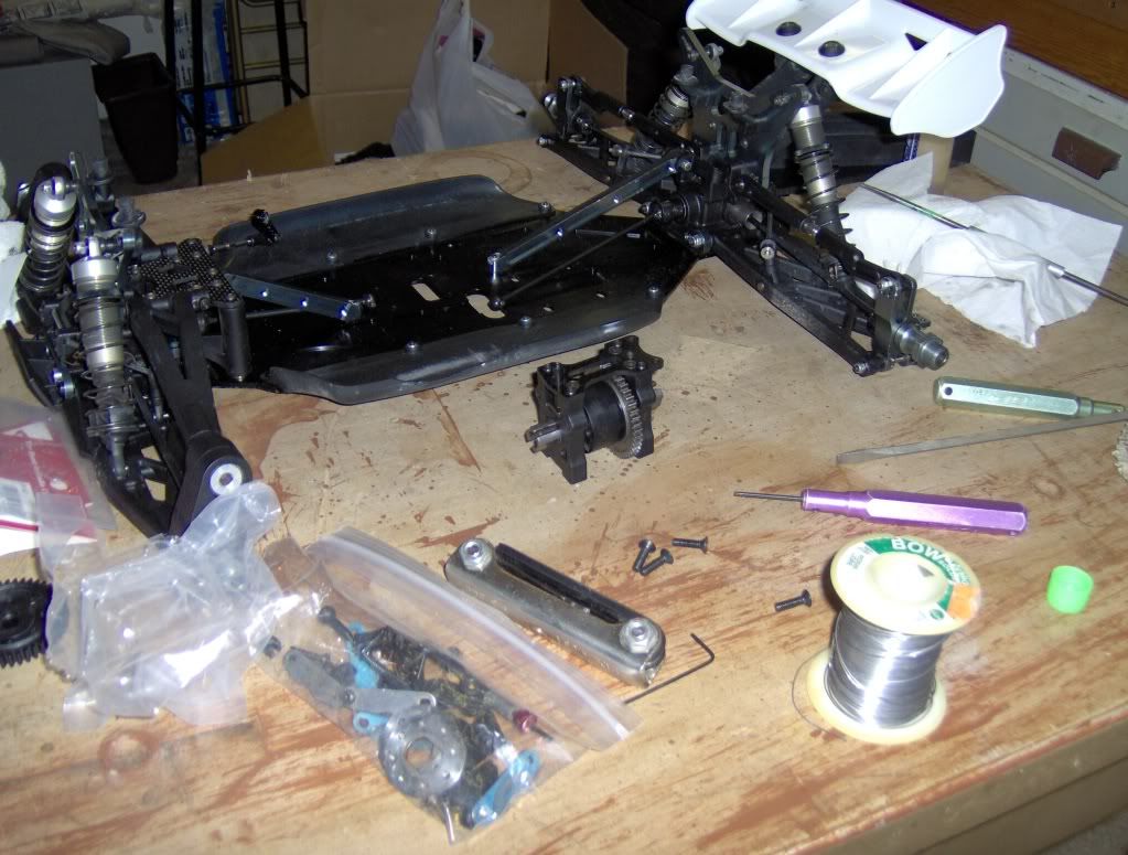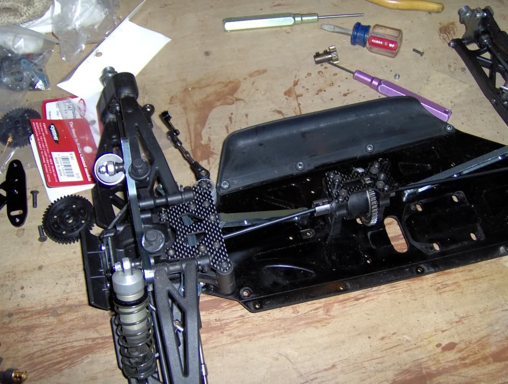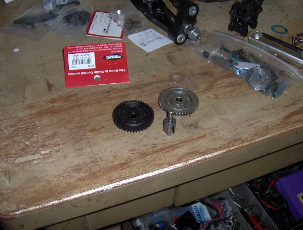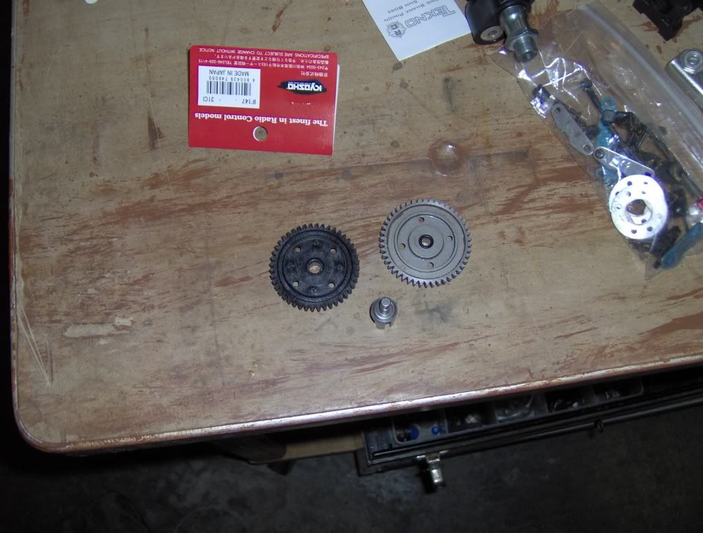 Tore apart the center diff to put in 10K fluid and take off the mech brakes. I also wanted to see if I could mount a plastic 44T Kyosho spur. Not sure if I can yet, we'll see.