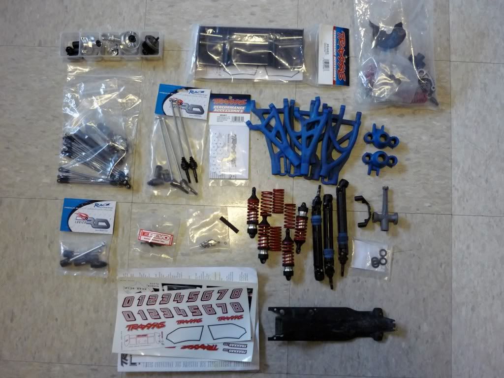 Parts and extras include: full set of CVDs, full set of RPM arms, pair of RPM knuckles, exo-carbon wing, variable dampening kit, tie rods and turnbuckles, stock driveshafts, shocks and springs, 32P pinion, adjustment tools, decals, and other assorted bits and pieces.