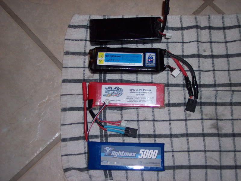 2. Poly R/C: 3s 11.1v 5000mah 40c. Bought this brand new and this pack is a monster. Enerland cells, maybe 12 cycles through it if that. It was too much for the Rustler...