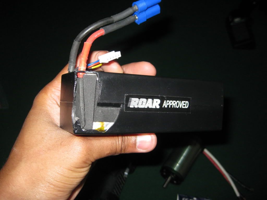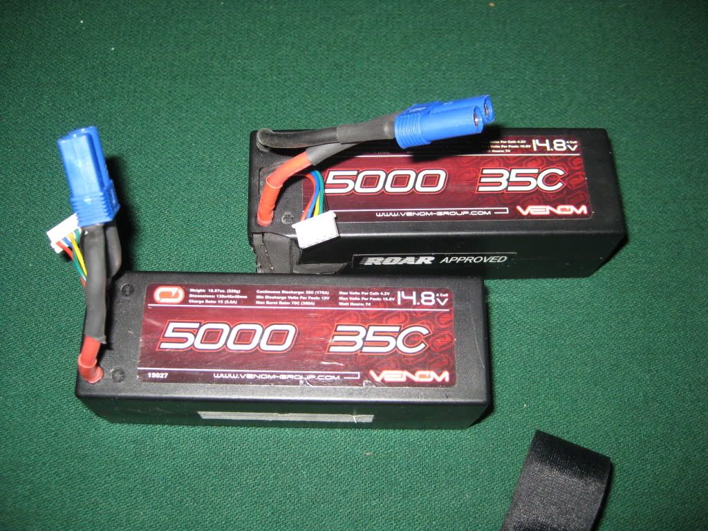 Last is a pair of Venom 4s 5000mah 35c hardcase Roar Approved lipos. Model number 15027. These cost $100 each at towerhobbies. They've seen 3 cycles and could pass for new if it weren't for the crack in the case on one of them. The lipos have a ton of foam padding on the inside and in perfect shape. I was going to tape a piece of thin sheet metal over this area, but I wanted everyone to be able to see the hole before I did so. Both batteries have EC5 connectors for super high current handling and JST-XH balance plugs.