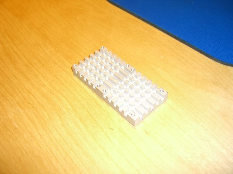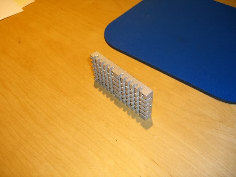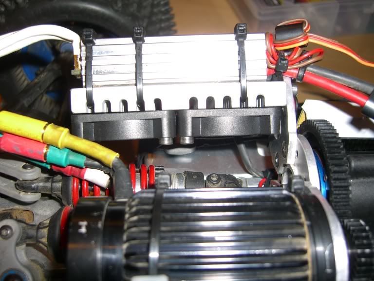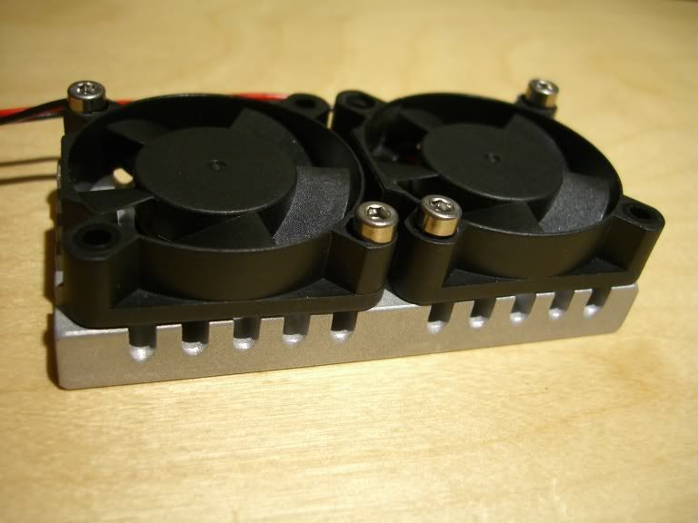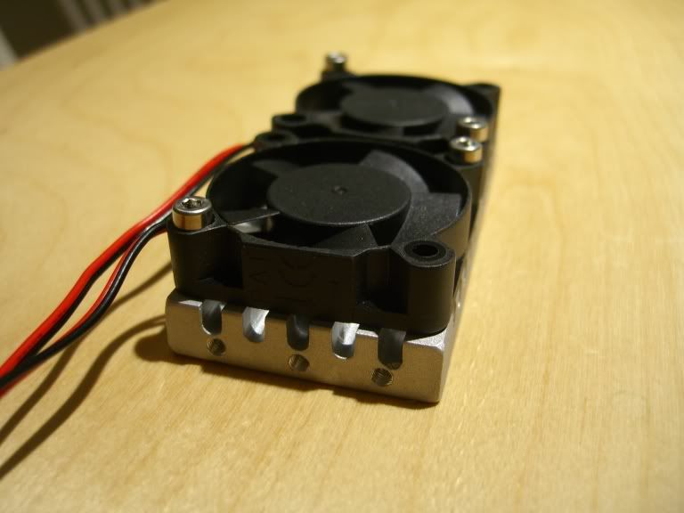 OK I finally got sick of riding the edge of thermaling my quark all the time so I designed up a simple heat sink that mounts to the motor mount bracket of either the stock emaxx transmission or the gmaxx motor mount. I designed it in solidworks and had the shop at work machine it up for me in one of the cnc mills. Its flat on one side for mounting to the flat back of the quark and has radiator fins and screw holes for mounting (2) 5V 40mm fans. I mounted the quark to it using the termal paste they use for computer chips.