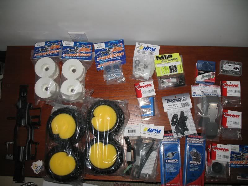 I had an idea of the direction I wanted to go with the truck and what parts to get. Based on the advice given here and else where on the net. I didn't plan on buying it all at once but most of it went on clearance the day I was going to make an order so I got all the parts I wanted. A few things are left out of the picture and the Vantage chassis and center diff/rear brake are for a waterproof Revo I'm planning. And you guys are right 23mm Proline adapters are less then impressive.