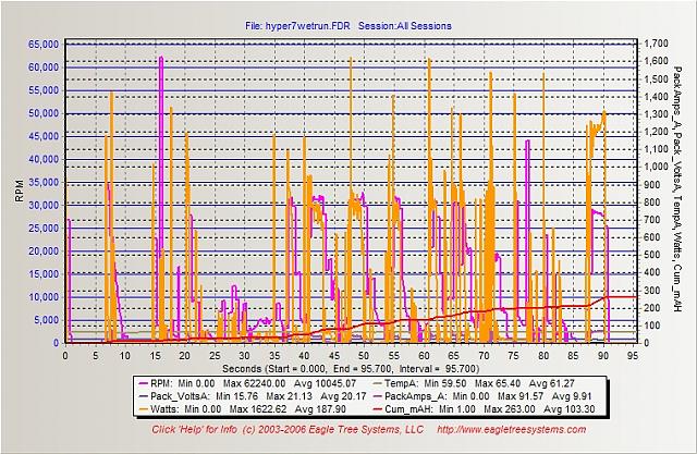 I'm running a 10XL, BK 9920, CCBEC (although I am using a RX pack right now) 13/46 gearing, although I think I'm going to go to 15/46. That and the motor mount from Mike and I'm good to go. Well, after I figure out a battery tray. Also attaching a graph from the eagletree. The concrete is wet here off of my front porch, so the amp draws don't look to impressive, due to near-instant wheelspin. I have a 1,600w peak in there tho. I wish I could see what those numbers look like on dry ground. Ah well.