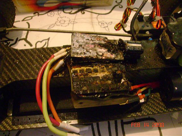 . That's when I didn't hesitate and went running towards the truck took the body off and unplugged everything. The flames happened very fast and you can see it almost burned the body and the wires from one of the packs. The Velcro straps melted in a couple of spots. Man, I was loving this controller as all I heard from others was the horrible stories of it catching on fire. So if you have a Schulze and your vehicle rolls backwards, don't hit the throttle. Wait until it comes to a complete stop