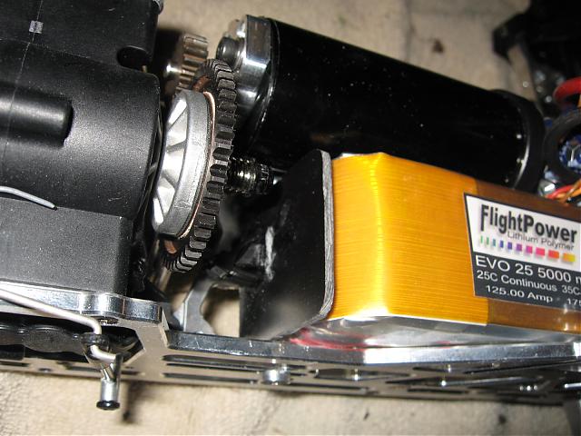 I also ordered the 52T hardened steel spur from Golden Horizons. As jhautz talked about it will add some needed space between the battery and the motor. I must say the metal on metal pinion/spur setup is really noisy and vibrates everything. The sound is pretty harsh. Kershaw sells some 5mm mod 1 delrin pinions with brass centers that might be worth trying. I just don't know how they would hold up though, probably not last long.