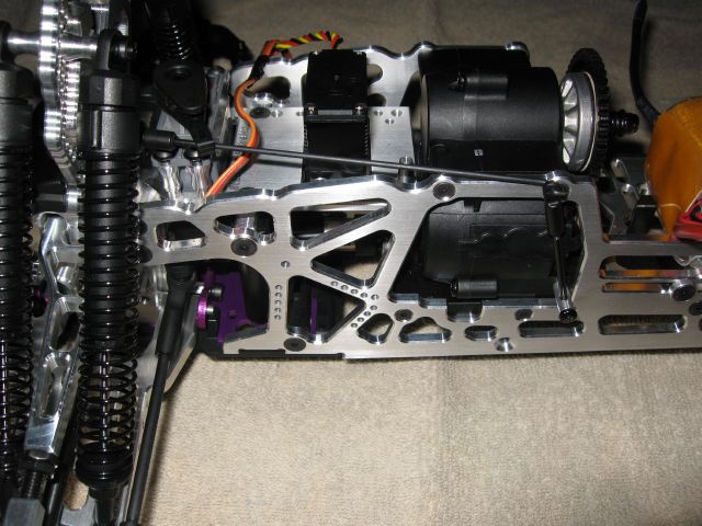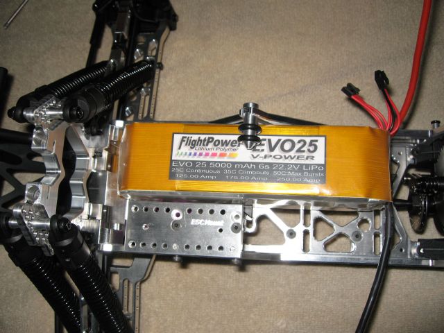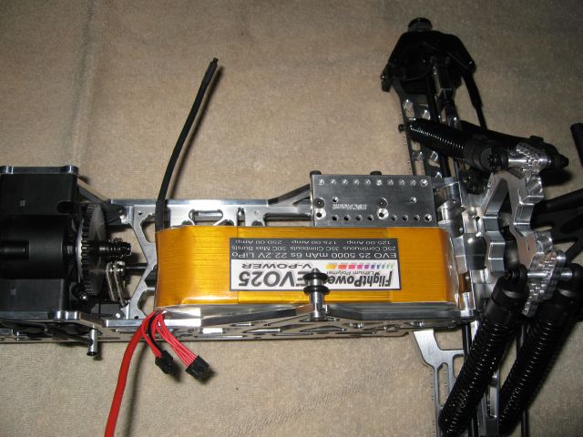 I made a barrier as discussed to stop the battery from hitting the spur during bashing. I used a dremel and cut it out of a piece of carbon board. I attached it to one of the posts supplied with the kit using zip ties and CA.
