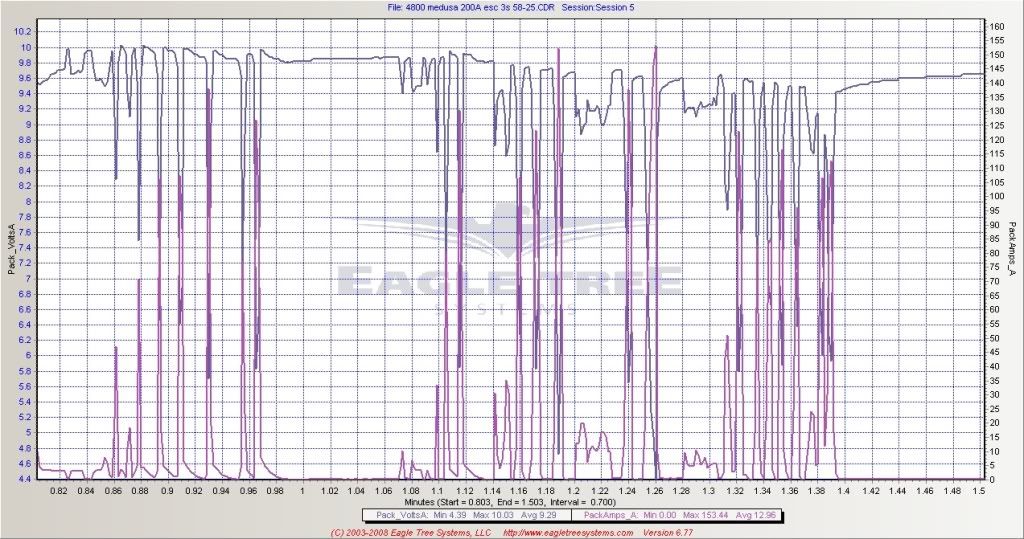 I hooked up the 4800kv Medusa onto the Rustler with the heavy beadlocks and Imex tires. With the use of a cold 3s1p A123, 200A ESC, 58/25 gearing, it pulled my voltage down to 4.39V@153A, peak 786W. I'll drive it around through grass tomorrow and see how the motor and esc behave.