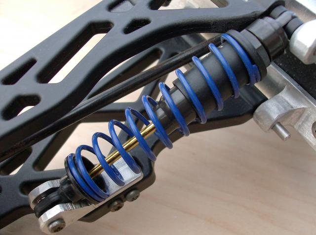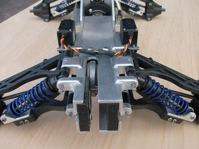 I took a fair amount of time looking at various manufacturer's suspension parts, and settled on the LST2/Muggy bits. Prices are better than what I was used to seeing with Traxxas parts, by a lot. And I definitely wanted away from the Traxxas knuckle setup, so next up, suspension. I knew I wanted a laydown shock angle to keep the towers short. Experimenting a little, I figured out I didn't need towers at all. Yes, some Maxx parts found new life here. And already having the heavy Trinity springs made this work. I actually changed nothing other than preload spacers, they still have 45wt silicone, and single hole pistons. Only 4 of them vs. 8 on the Maxx. Delrin spacers were made to take up the clearance on the 4mm pin on top, and I made the lower shock mounts to get my ride height, those still need some finish work. The suspension is very Revo-ish feeling now, very compliant without being undersprung. In fact I liken it to Revo suspension without the cantilever linkages. The results here were far better than expected! No towers means I have unlimited options for body layouts, so that's a huge plus.