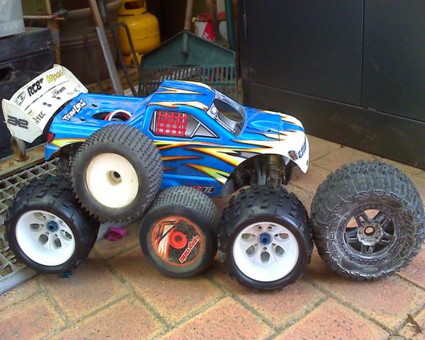 here are some pics of my muggy with big joes on her, runs like a dream with hd cups, rims are 420 losi dish dyed black. I love them just make sure to put two runs of tape on them if you are going to tape them up, if you only do one single run of tape down the middle it will expand on the outsides of the tape and you'll be ticked off... http://www.rctech.net/forum/nitro-of...rigs-pics.html