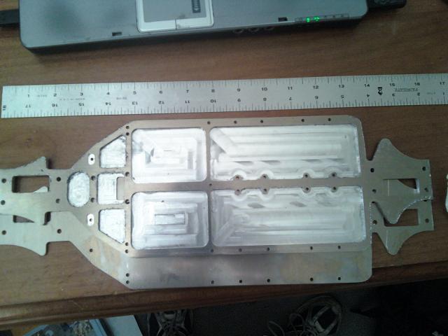 So far, the velcro has been working well in terms of holding the batteries down. I still have not made a chassis brace yet, but I have gotten away without one sor far. My first priority is to remake the chassis with better jigging in the machine. The pockets ended up being to deep in some places because the aluminum sheet bowwed upward during cutting. Some places are paper thin and have caused me to worry. There are also some slight changes that I want to impliment that will relieve stress at the hole locations where I can see some cracks initiating.