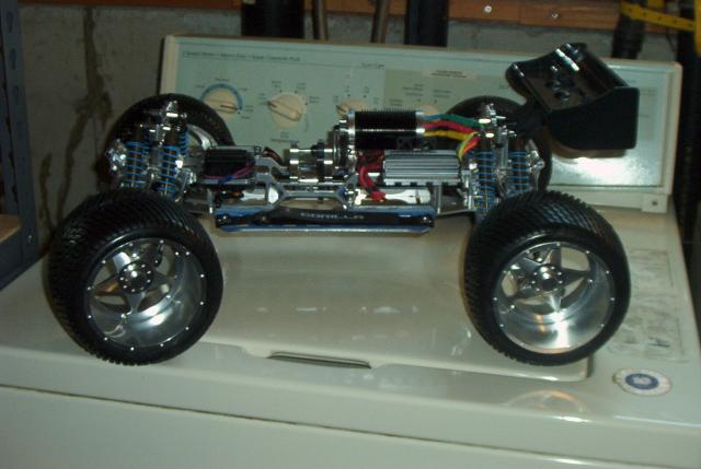 This truck has RDLogics wheels on it, GorillaMaxx chassis with a custom rear upper deck that integrated a heat sink for the Quark ESC(which is also modified with a couple ounces of extra copper inside). Also has the original Slipperential transmission installed. :)
