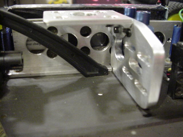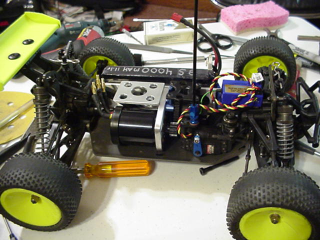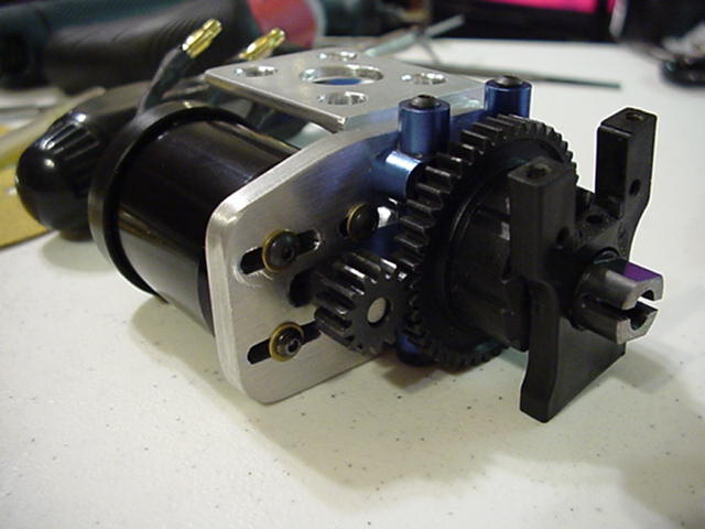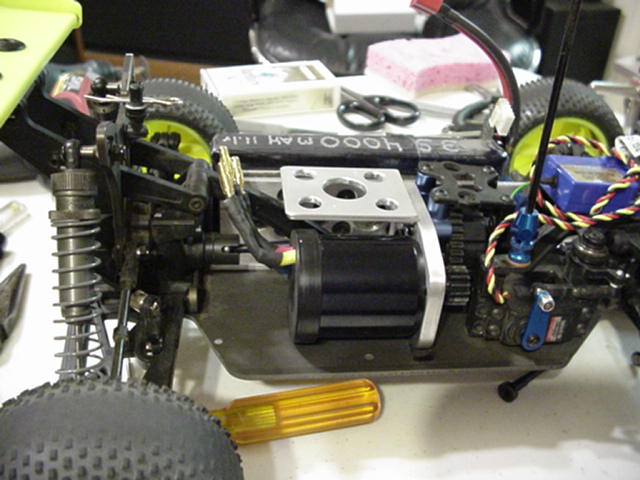 I snaped a shot of the motor and battery mount the blue aluminum diff mount is off my CRT with the buggy diff tubes it's 2 pc's and clamps the diff bearing so I can put the diff in and set the pinion & spur mesh with the motor and diff out of the chassis.:027: