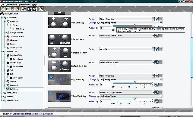 The PC software for setting up the React is awesome and you can control every component of the setup (it even has ABS braking configuration, servo speed settings, and you can setup channel mixing - all on the pc). Also, the remote is software controlled via flash memory - so update to the functionality of the controller can be produced via updates from Nomadio.