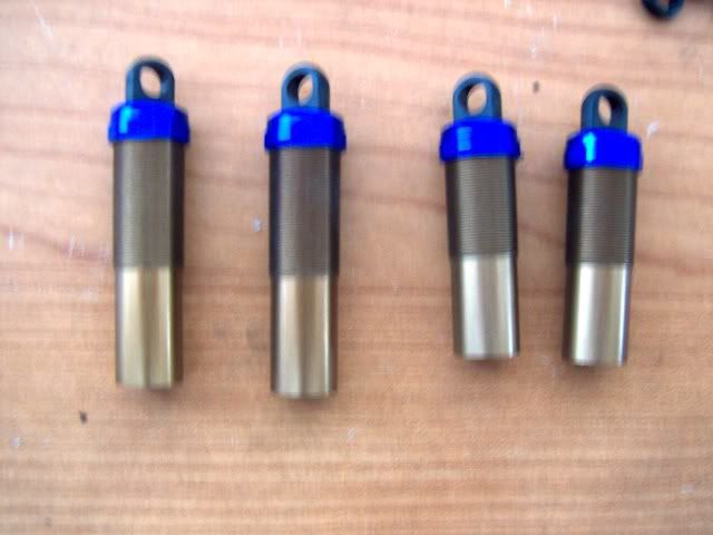 Now install the caps onto the shock bodies. In hindsight, I probably should have oiled the o-rings before I tightened the caps on, but they didn't have any leaking issues that I can see so far. Honestly, I'm not even sure why there are caps on these shocks... they could have been solid and worked the same, but hey, the blue looks good.