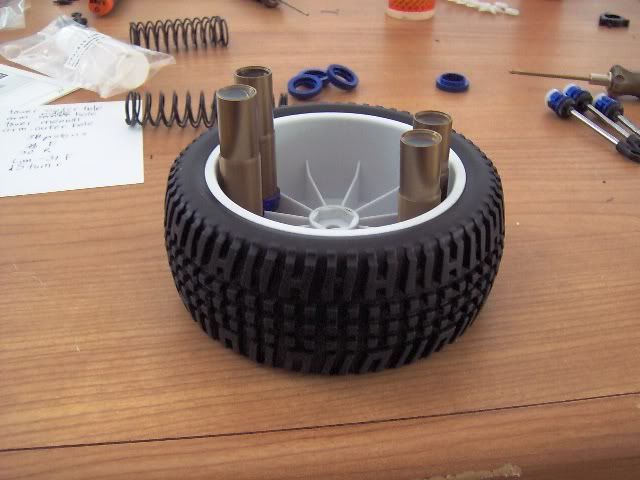 Next it's time to fill the shock bodies with oil. Turns out a Rulux wheel makes a killer shock body stand. I let them sit for a bit to make sure there was no air in the bodies.