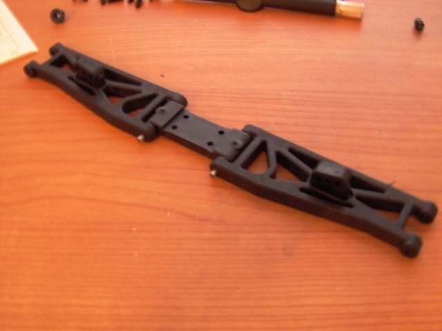 Now we assemble them to the arms. Captured pins yet again. These actually use the same style hinge pin as the Losi 8ight. Two nuts thread onto it, one on either side, to secure it. For having so many methods of capturing pins on one truck I feel confident that they will all hold quite well. Every hinge point on this truck has been perfect. No slop, but not bound up either.