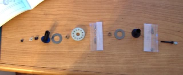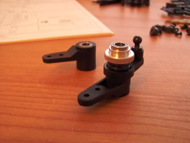 Now assemble the bellcranks and steering posts. I did make one change on this step. The kit comes with what appears to be 2 steel bushings that go into the steering rack to act as the pivot between rack and the bellcranks. I replaced these bushings with two 3x6x2.5mm flanged bearings. The bushings would work fine, but they bearings should last much longer.