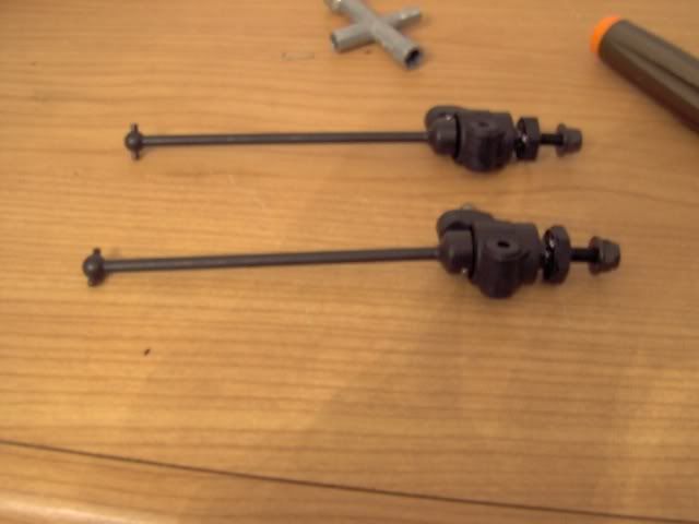 Now assemble the rear hubs... more plastic spacers. These are some very nice looking CVD units. They're small compared to the MIP units I'm used to, but I've heard really good things about them. I like that I can adjust roll with some spacers on these hubs. Plastic hexes show up here as well. I should have aluminum ones on this truck before I run it a second time, but these should be plenty to get me through Friday's race.