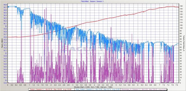 Ok, couldn't get the chart from yesterday, but... I logged some mopre runs today, 1st with a 14T and 2nd with a 16T pinion. I put a huge heatsink and fan on to save my motor and set the LVC to 3.4.