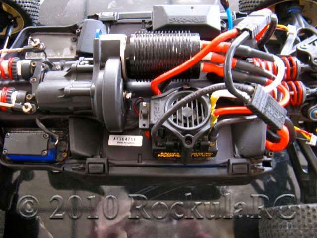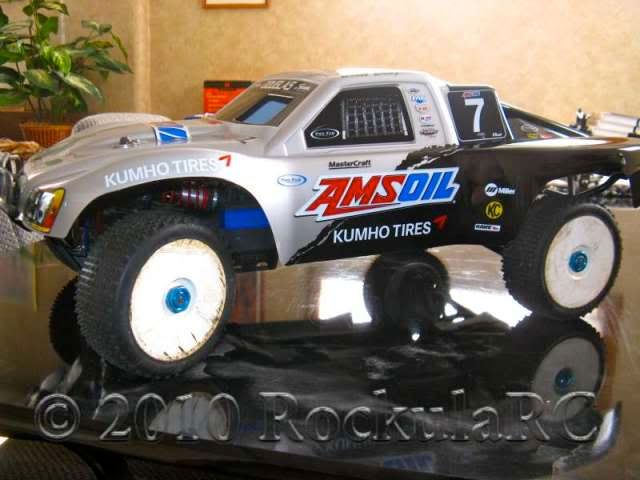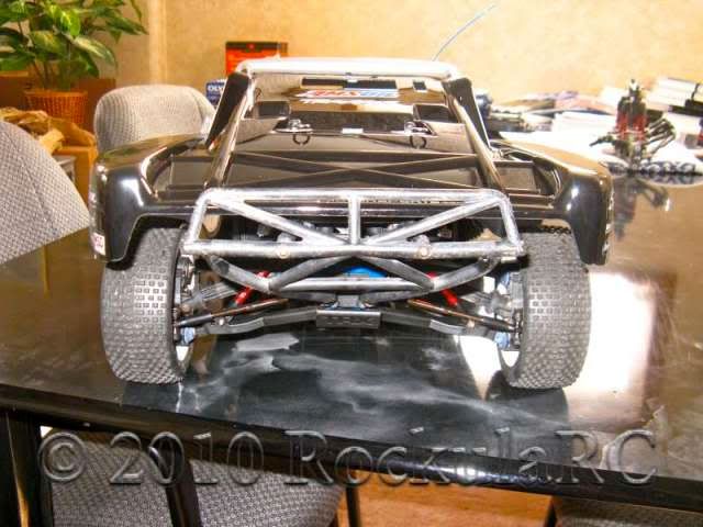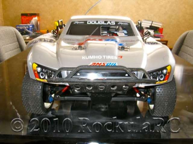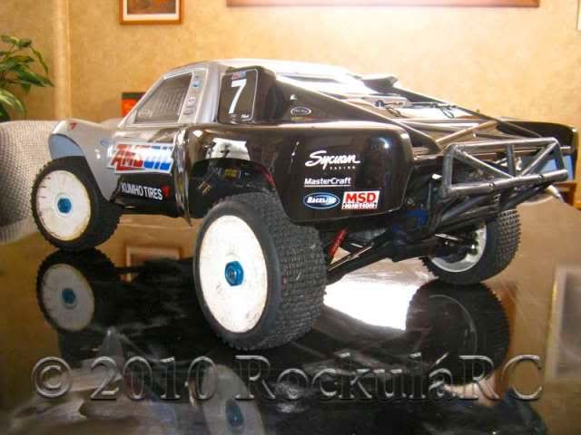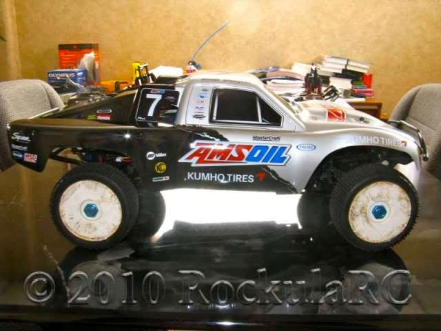 Too bad my tires are beat up, cuz it all looks so nice and shiny! I still need to dial in my toe in the front a little bit, but that's it. I've also Gorilla taped all the unnecc holes in the body as well. I'll be anxious for ProLine to release a .060 Lexan body, that's for sure. This one won't last long. As you can see, the drawback with the ERevo platform is that you can't run side bumpers, unless you fabbed up some yourself.