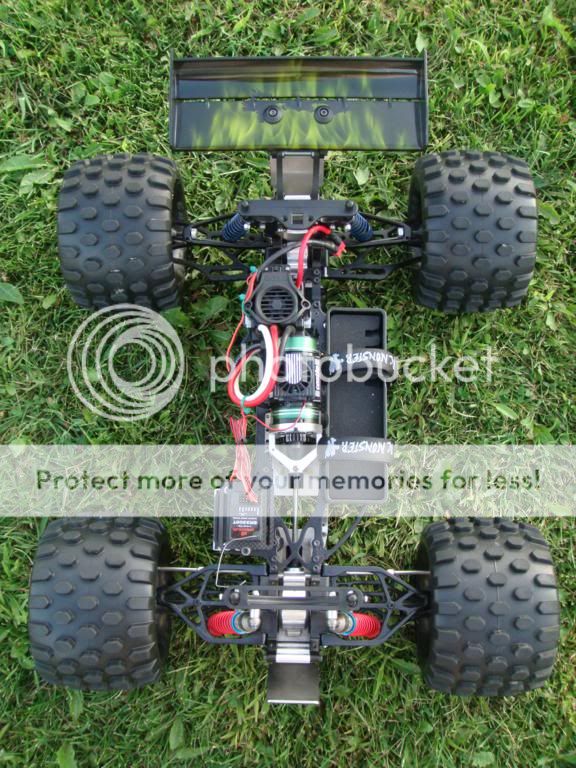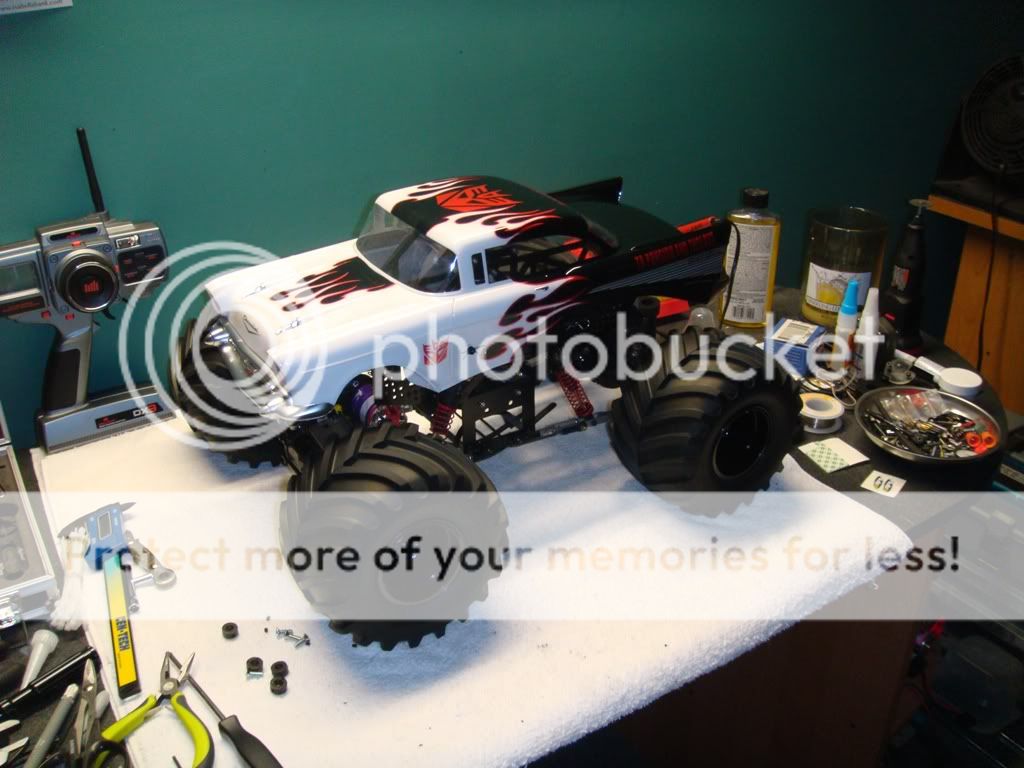 Got the rear knuckles shaved down so I could install this set of Monsters I got. Installed a Castle motor cooling fan and a Savox servo a while back. Pretty much complete now, only thing left to do is install some limiter straps.