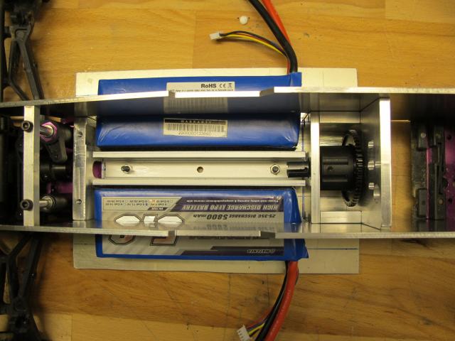 The batteries will rest against the U-shaped alu part in the center line... which will protect dogbone from bats or is it the other way round? 10T pinion fitted on the motor :)