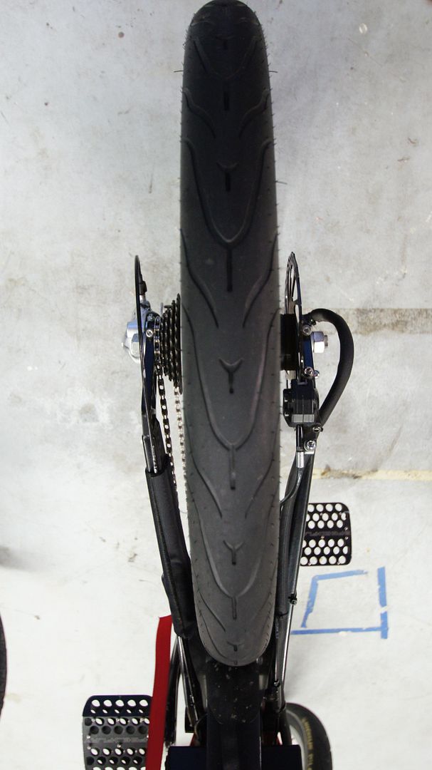 So instead of going with the moto rear wheel, I swapped over to my old Michelin's tires that was on my EVG bike. Big difference in how much better they ride vs the Crazy Bob's. Less rolling resistance, hang lower in corners, I can power out of corners without fear and a little wider contact patch on the rear tire. The rear is 66 mm at its widest and 42 psi inflated. It's a bit lower pressure compared to the Crazy Bob's. I've decided to keep the Raptor on the streets for a while and just run my mid drive on the trails.