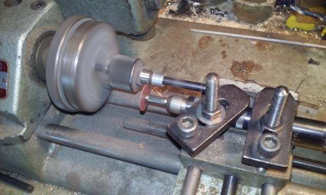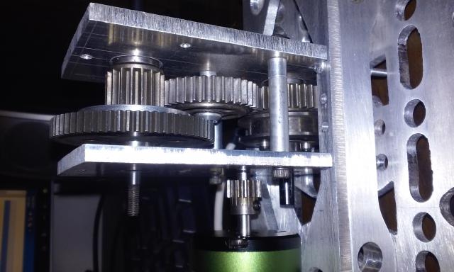 Boy these forums are jumpin lately,lol.Its a good thing i have a few other builds lined up.NO one knows the weight of the stock new version chassi? To livin things up a bit here's an action shot of my home brew hardened metal grinder at work on the input gear(finally used the lathe...kinda).the gear mesh is prefect on the tranny but the metal gears & larger idler have added some rotating mass to the tranny.I suspect it will put more stress on the elecs during startup & breaking than i want but fortunately once i drop in a slipperential in Ill just have to build an extra large scale crawler to stick this in.(maybe resurrect & redesign the orange Cmaxx crawler from the pic on page 1,the chassi has been collecting dust in the shop for years & could use some action, the internal slipper was a last minute change & i have a plan for mounting the motor to the tranny with a mounting plate that will allow for easy removal & mesh adjustment just need some more fab time,been installing a new leech line for a neighbor the past few days along with the normal stuff so times been short..Oh i did get the servo mount figured out also.