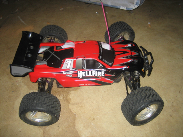 So, this truck just sat around in the basement until about a week ago. I got bored with busting up the tranny gears in my e-revo, and used the electronics from it to get the hellfire together. Here's what I came up with.