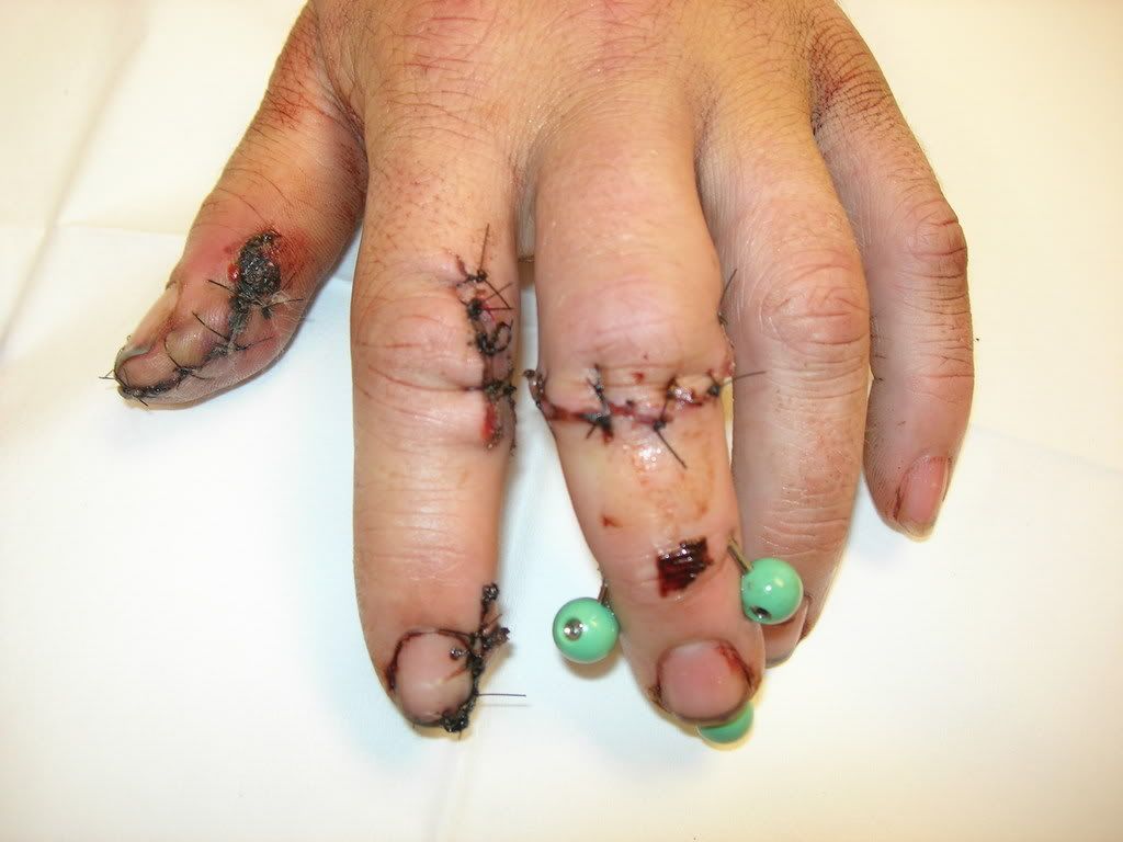 These are the photo's of the aftermath of an arguement I recently had with a tablesaw. I got into the thumb and pointer finger pretty good, chopped about 1/8" off the nuckle end of my middle finger bone ( read no more nuckle function ), and now I think I'll have to close the door on my mobile mechanics business. Time to start looking into new career options, a life change moment.