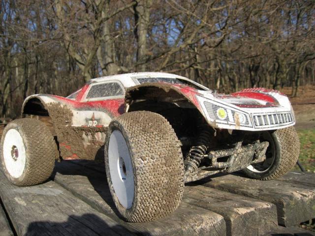 On its first maiden a few gas stabs on asphalt showed that top speed was right were i expected it to be. No need for a smaller or bigger pinion from a speed point of view. Eventhough my typical RC spot was completely soaked, wet and muddy (snow had almost melted) i chose to give it a run. Everything went fine aside from 2 tires which came partly unglued.