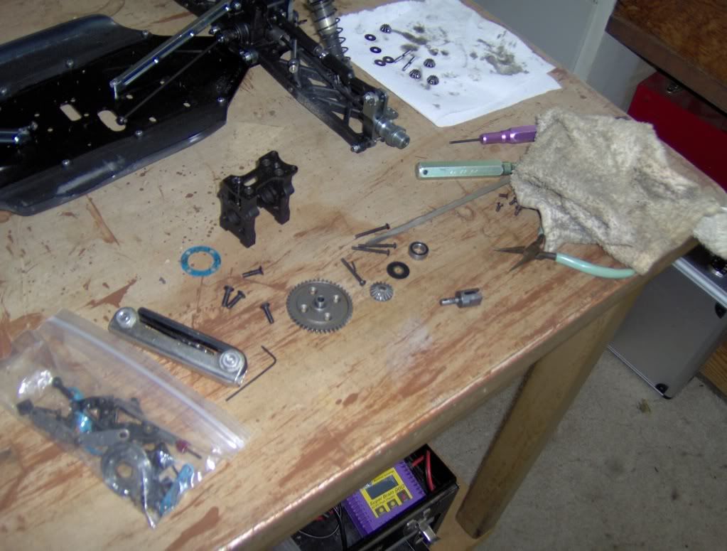 Tore apart the center diff to put in 10K fluid and take off the mech brakes. I also wanted to see if I could mount a plastic 44T Kyosho spur. Not sure if I can yet, we'll see.