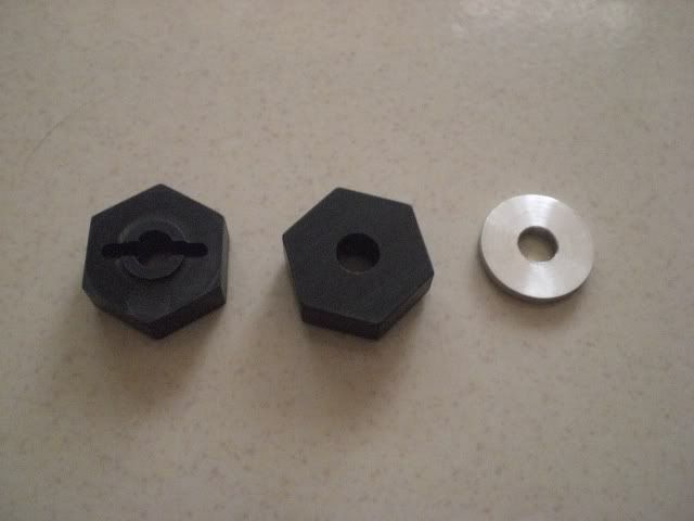 The adapters bring a short course truck back to stock width with 1/8 buggy wheels/tires.