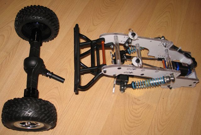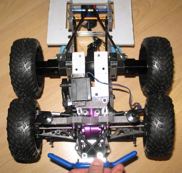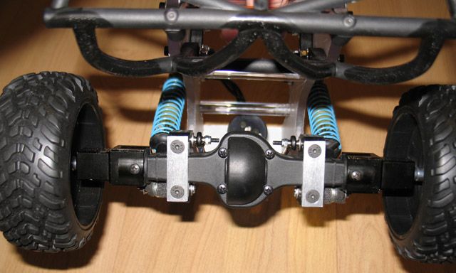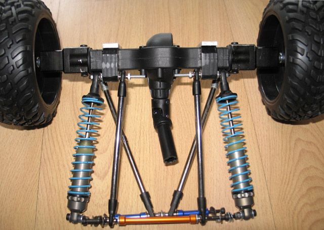 -HPI Wheely King rear axle with RC4WD straight-axle adapters, custom c-clamps for mounting of the 4-link suspension, STRC widener kit, and Ofna Super Shocks