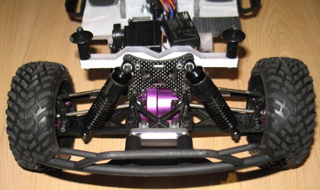 -HPI MT2 18SS front end with aluminum differential housing, aluminum knuckles, carbon fiber shock tower, and GS Storm 1/8 buggy front shocks