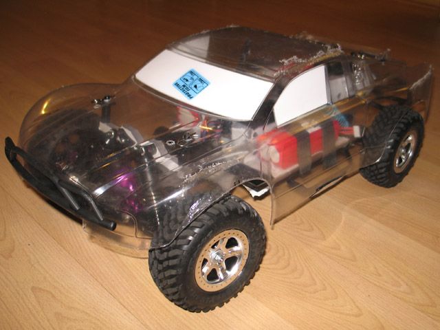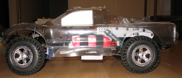This truck has interesting handling thus far - the rear shock oil (45wt) is too thick, and the rear needs a sway bar BADLY. Right now when I pitch the truck the chassis leans, and leans for too long after pointing the truck in a straight line. This is no doubt the result of the shock oil not allowing for a quick enough weight transfer, and will be fixed. In the soon-to-come pictures you will notice the torn up overspray film on the body, please ignore that