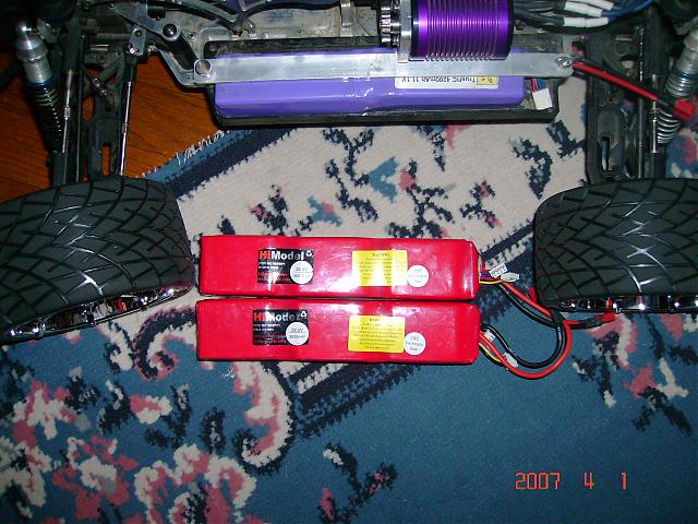 You can try and see if 12S 2200mAh (4 x 6S 2200mAh) in a long style pack will do. The pack inside my truck in the pictures show how a 4400mAh 3S2P long pack looks like. That pack can be 6S1P for 22volts. Some places has good 25C and 30C 2200-2600mAh 6S packs. Thunder Power has the following: TP2600-6SXV, 22.2V, 6-Cell, 410g, 44x39x125 and $179.99 or TP2200-6SXV, 22.2V, 6-Cell, 340g, 51x33x107 and $149.99. You can also use the long type higher mAh packs like the following: http://www.kongpower.com/product_en/...pkind_recno=KP or http://www.airthunder.com/5000mah222...erypack-2.aspx. I know Flight power makes the long type packs as well. With the higher mAh pack all you do is put one on each side of the chassis and make a plug to hook up both controllers to them. The only weak link now will be the moving parts.