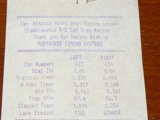 Unofficially, I believe, the 1.256 pass is the quickest top fuel pass made with a 540 size motor to date. Which is pretty cool since I've only been doing it for a couple of years. Romano (snellemin) was there when I came to a test 'n tune session at Track 21 in NW Houston back in 2008, my first time, with my speed Rustler.